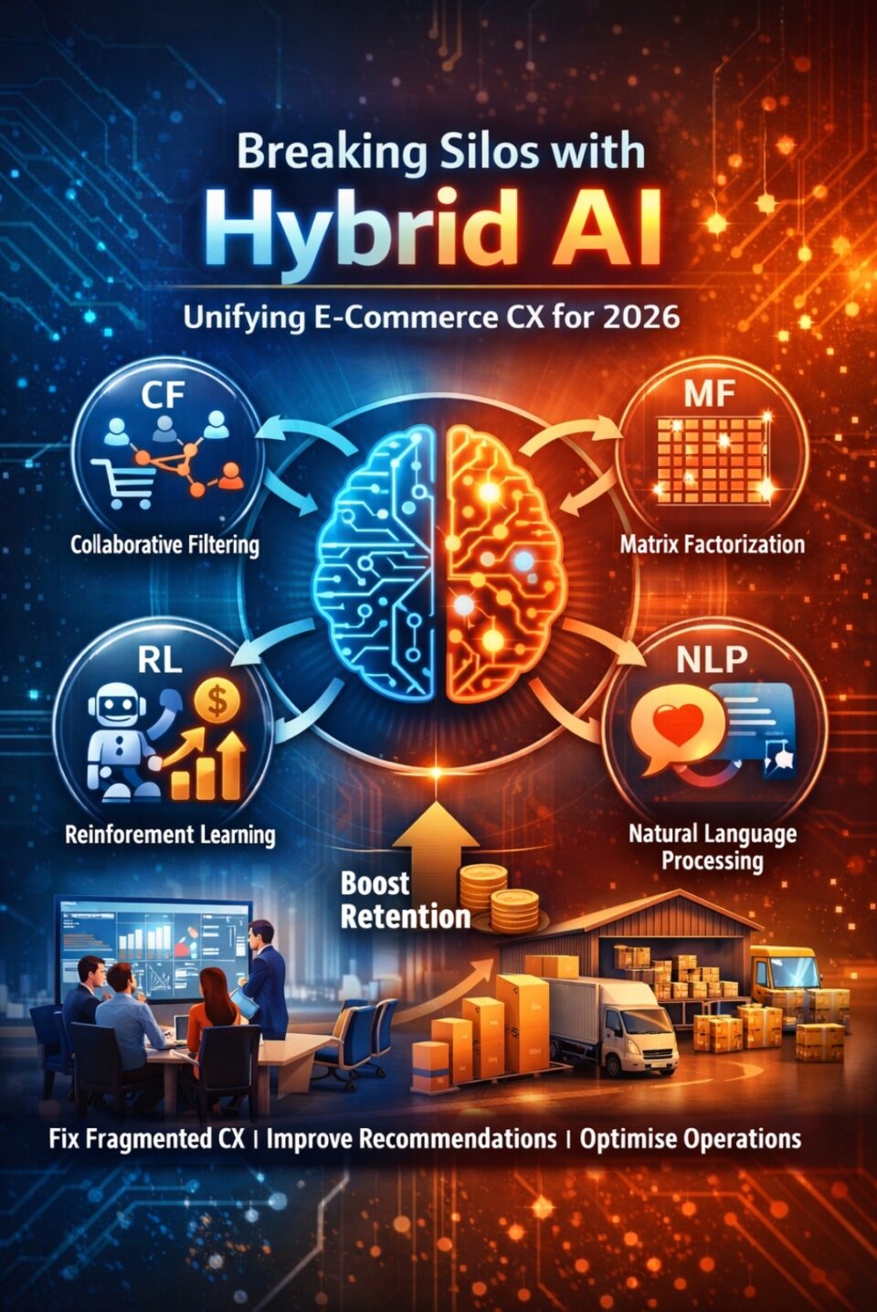 E-commerce surges demand unified intelligence. This article explores a novel hybrid framework blending Collaborative Filtering (CF), Matrix Factorization (MF), Reinforcement Learning (RL), and Natural Language Processing (NLP). It tackles real CX hurdles like siloed operations, AI gaps, and journey fragmentation. Leaders gain actionable strategies for 2026 implementation.