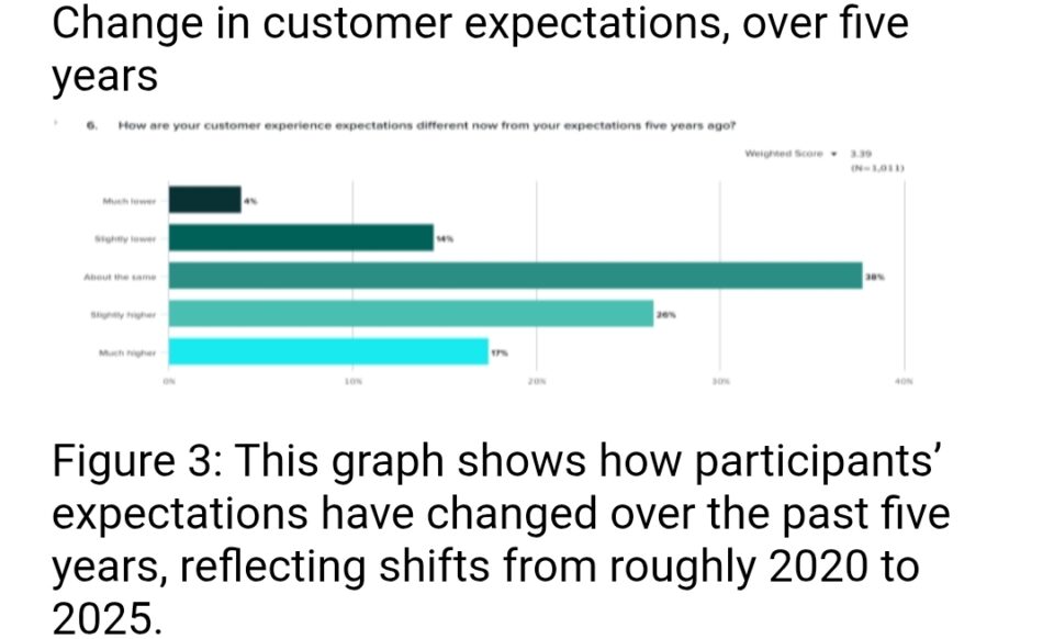 Since 2020, the bar for customer expectations has been steadily rising. Nearly half of respondents said their expectations in 2025 were higher than five years prior, with Millennials (52%) and Gen Z (46%) reporting the steepest climb. The educated segments — those with master’s degrees or higher — showed the strongest increase in expectations, demanding faster, clearer, and fairer interactions across all digital touchpoints.