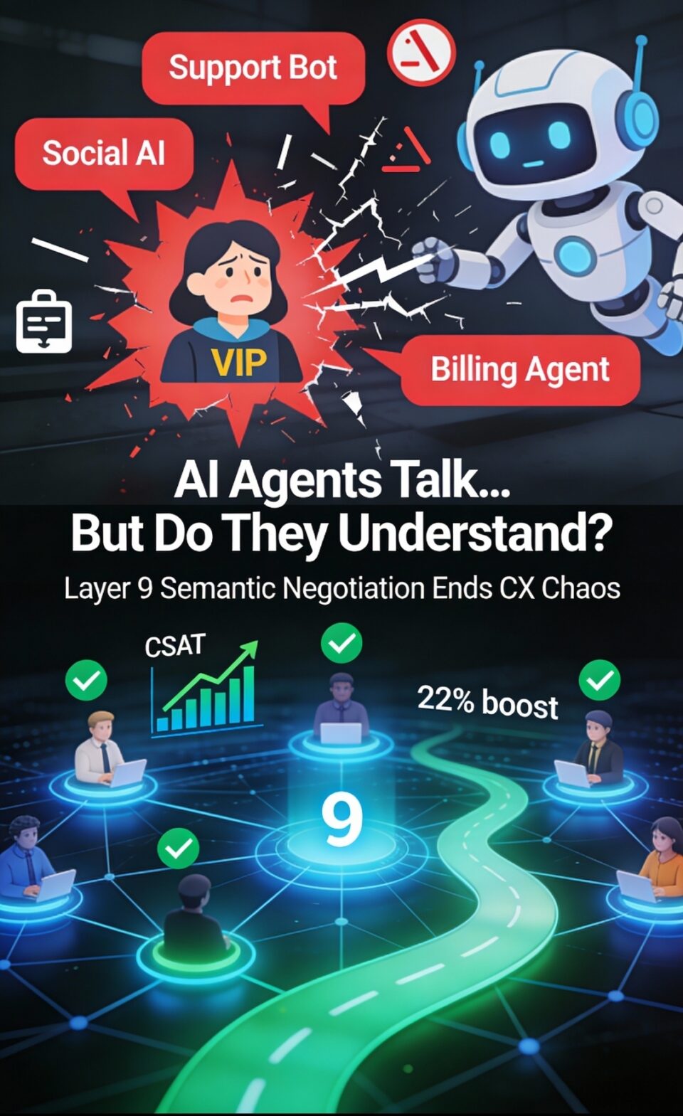 This nightmare hits 78% of CX leaders. Teams battle AI gaps where bots lack shared meaning. A new Layer 9 Semantic Negotiation framework changes that. It equips agents to align semantics upfront, slashing errors by 40% in pilots.