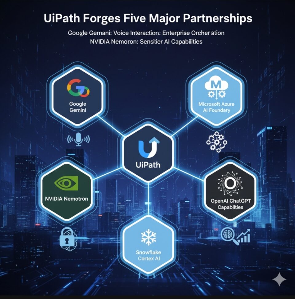 The company forged five major UiPath partnerships simultaneously: Google’s Gemini models for voice interaction, Microsoft Azure AI Foundry for enterprise orchestration, NVIDIA’s Nemotron models for sensitive workflows, OpenAI’s ChatGPT for frontier AI capabilities, and Snowflake’s Cortex AI for data-driven insights.